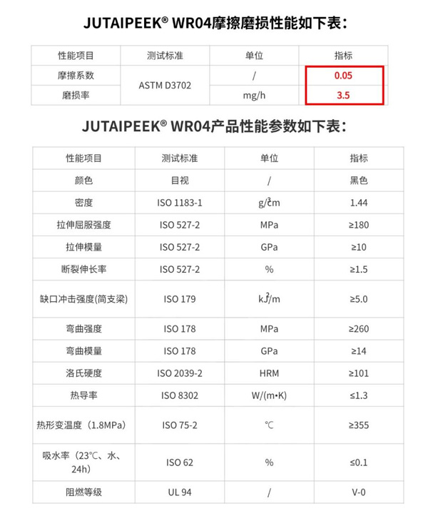 JUTAIPEEK?WR04具備極低磨損率,摩擦系數(shù)低至PTFE水平,這意味著在相同條件下,它與其他材料之間的摩擦阻力更小,有助于減少能耗和磨損。摩擦系數(shù)僅有普通PEEK的1/6,JUTAIPEEK?WR04耐磨損性能遠(yuǎn)超傳統(tǒng)材料,即使在極端條件下,如高速摩擦、重載或惡劣的摩擦介質(zhì)中,能夠有效減少磨損,延長(zhǎng)使用壽命。這種特性使得JUTAIPEEK?WR04成為滑動(dòng)部件、軸承、齒輪等關(guān)鍵機(jī)械部件的理想選擇。