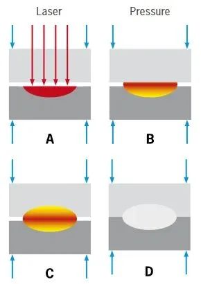 步驟三:接觸面下方的吸光焊件吸收激光能量并產(chǎn)生熱量,經(jīng)過(guò)熱傳導(dǎo)作用使得焊接接觸面熔化,在夾具壓力下,熔融狀態(tài)下的塑料充分混合。