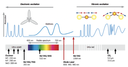 大多數(shù)聚合物(較淺的藍(lán)色曲線)在可見(jiàn)光和近紅外光譜范圍內(nèi)通常是透明或半透明的。通過(guò)添加顏料(較深的藍(lán)色曲線),可以實(shí)現(xiàn)對(duì)激光波長(zhǎng)的適當(dāng)吸收。