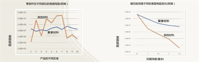 優(yōu)異的抗靜電性,表面電阻率108-109Ω/sq,表面電阻率均勻、穩(wěn)定且集中,可應用于各種結構復雜零部件;